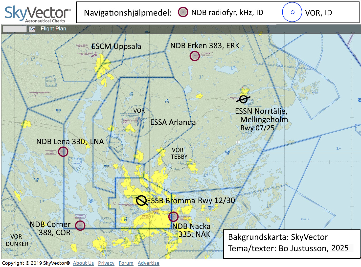 Karta över Stockholm med sista nedsläckta NDB, och kvarvarande VOR.