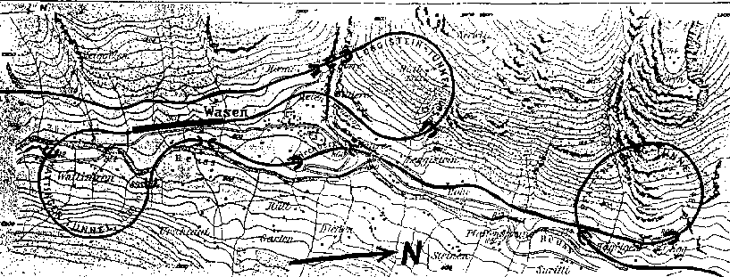 | Gotthard Line | The Gotthard line was built 1872-1882 for the north-south traffic through the Alps. The image shows a section north of the Gotthard tunnel. It has a loop tunnel and a serpentine when climbing up the mountain side at Wasen. | (Map from Uppfinningarnas bok. GIF-image 21k.) Sorry for the bad image quality, the image was difficult to scan. | |