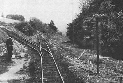 | Lower switch | The lower switch, with a water post for the steam locos. Photo: From 1948, reproduced from Wolff's paper. |