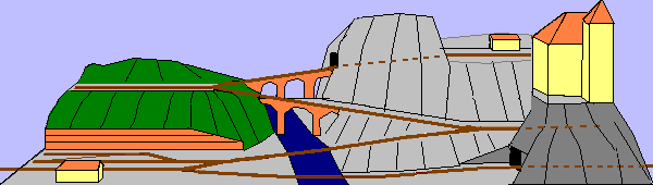 a. Small size - should fit on top of a bookshelf and have very low weight. b. Two stations well separated and with a reasonable transportation mission. c. A large forest, a high mountain with tunnels, a big river with bridges. d. And finally - a medieval castle! The solution is a N-scale layout 30x120 cm (1x4 feet) with small trains that shall transport tourists from a lower station via a zigzag up to a station with a castle. The trains are very short, only one loco and two cars. At the lower station the loco can switch between two passenger cars and two goods cars. |