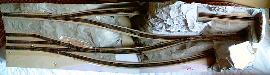 OneTRAK. After hearing about the OneTRAK-idea I added the through track in front. It passes under the cliff with the castle and connects to the outer world. - Read about OneTRAK at Northern Virginia NTRAK. |