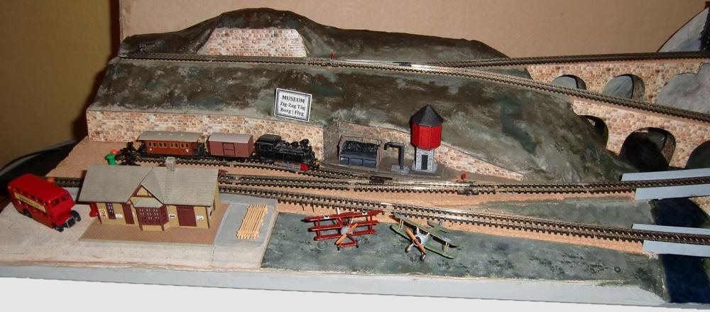 The other tracks are for a museum line from a valley station (Walthers) up to a castle, by a zig-zag track. The museum also has a double-decker bus (Matchbox), and two planes: Fokker Dr I (Revell) and Sopwith Camel. Layout size: 30x120 cm. N-scale. 9 mm gauge. |