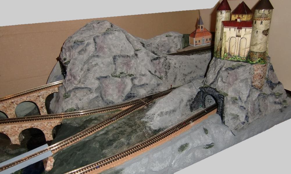 I have added some buildings and started to paint the mountains and vegetation. It remains to add grass turf, bushes, trees, and track ballast. |