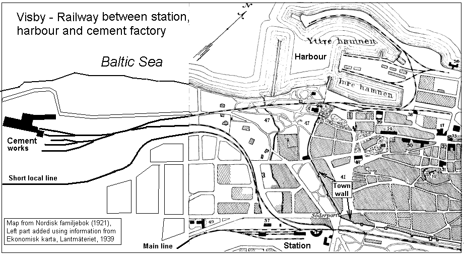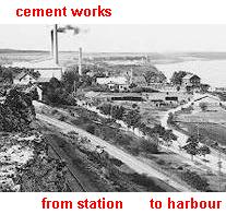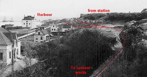 | Map | Map showing the line from station (elevation 39 metre) down to cement works and harbour. | |