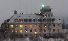 Flygplatsfyr idag Det finns även idag en flygplatsfyr på Västerås flygplats, men nu på kontrolltornet. Den blinkar vitt och grönt. Foto 2013, Bo Ju.