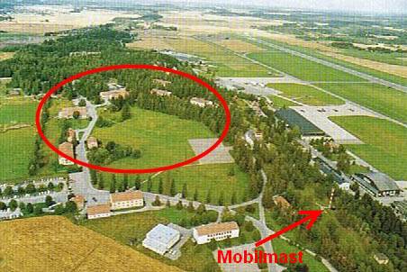 | Mobilmast 2013 = Rödvit mast 1979 = Fyrmast 1938? Det fanns en optisk flygplatsfyr på Hässlö flygplats redan 1938, 700m nordväst om de äldsta hangarerna. På foto 1979 syns en rödvit mast på flygfoto, och idag finns en mobilmast. Jag tror att alla tre är samma mast. Men, det är nog inte den på fyrfotot ovan. B: Bättre foto idag önskas! |