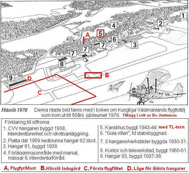 | År 1938 Karta och fakta Karta och fakta för Västerås/Hässlö flygplats, Svensk Flygkalender 1938. Det har senare byggts flera hangarer norr om de äldsta, och dessa har ersatts av en ny.