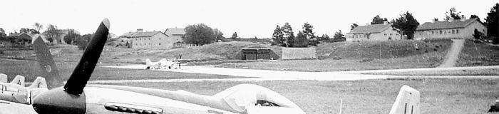 | Uppsala flygfält har en del kullar söder banorna, med byggnader och bergshangarer. Foto lånat från: • silvervingar.se - Om F16. - Här grymt hårt beskuret för att betona landskapet.