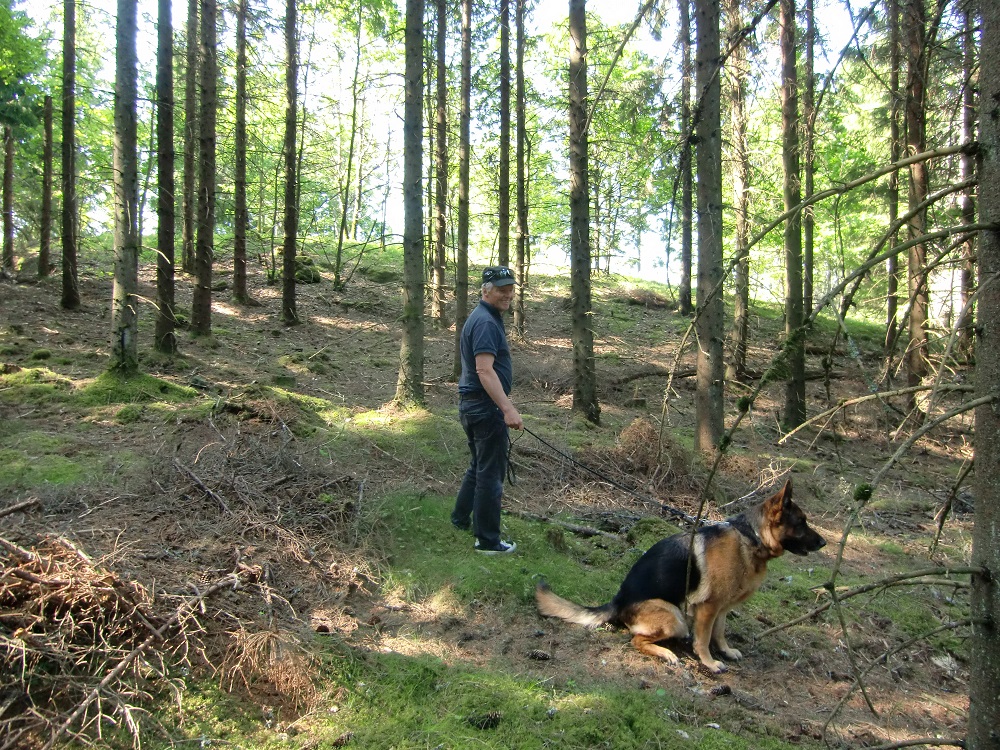 Sverker på väg upp mot toppen på åsen. Hunden Ferrari tvekar lite...
