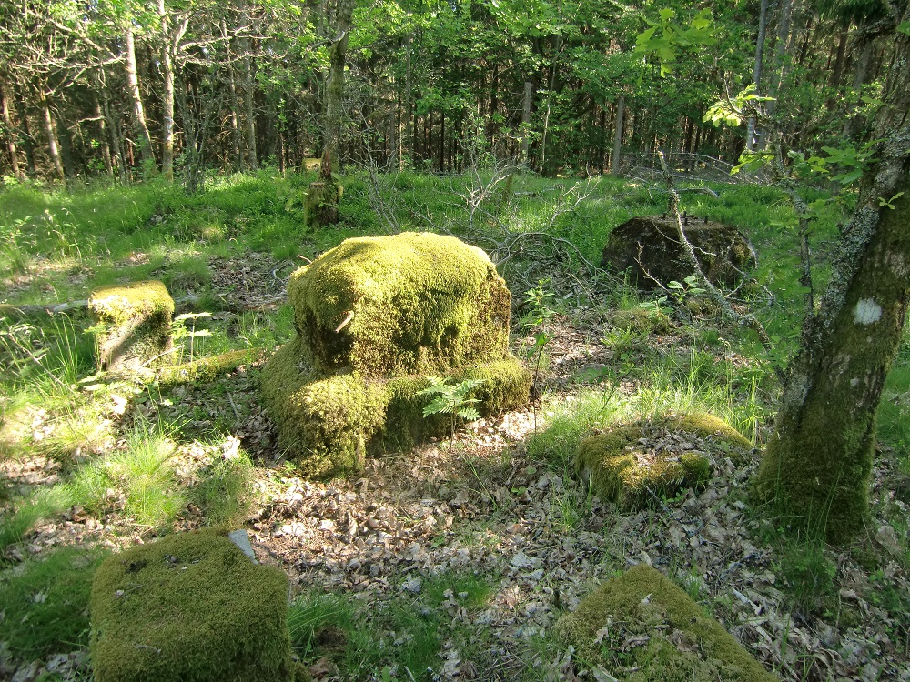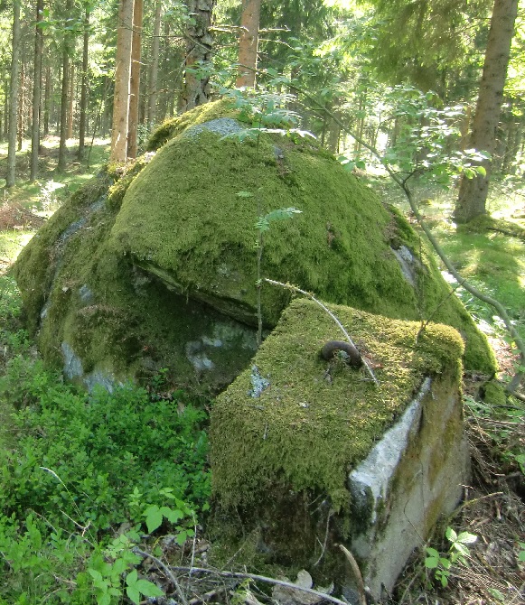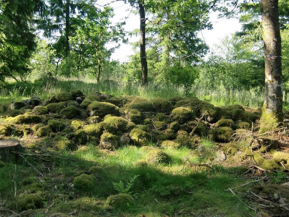 Kraftigt övermossad fyllning av 0,2 - 0,4 meter stora stenar. Gropig ojämn yta