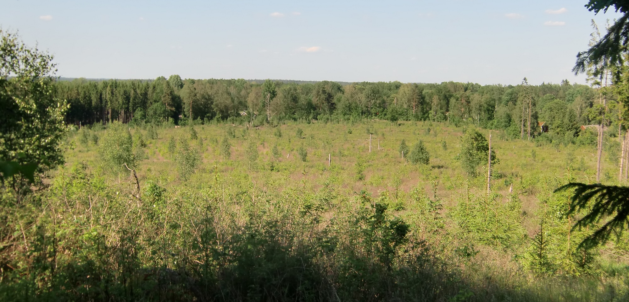Utsikt mot norr, över ett stort kalhygge. Långt i nordväst syns bergshöjder. Ett litet torp anas i högra kanten.