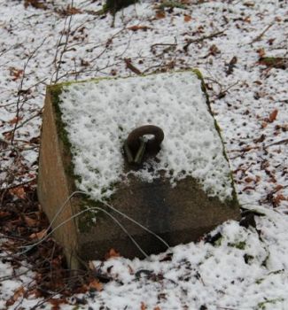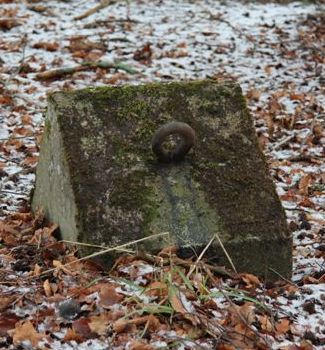 Närbild på betongplattan som hörde till luftbevakningstornet. De högra öglorna användes som gångjärn då man lyfte tornet.