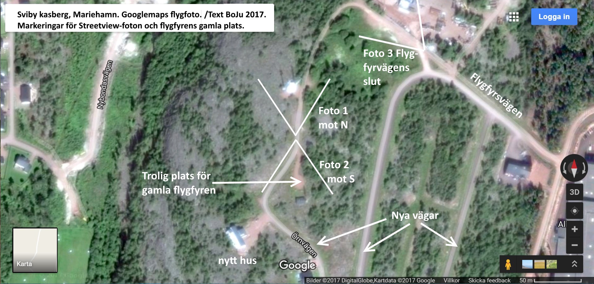 1930-talet. Detta är det första foto på fyren i Mariehamn som jag hittat. Notera att marken kring fyren på fotot är ganska platt. Det fanns betongtorn även på Kumlinge, Iniö och i Åbo, men de stod på små höjder/ bergknallar. Nutid: Under 2010-talet anlades nya vägar på Kasberget och ett antal villor med fin utsikt har byggts. På 1930-talet fanns bara en liten grusväg upp till fyren: Flygfyrsvägen. |