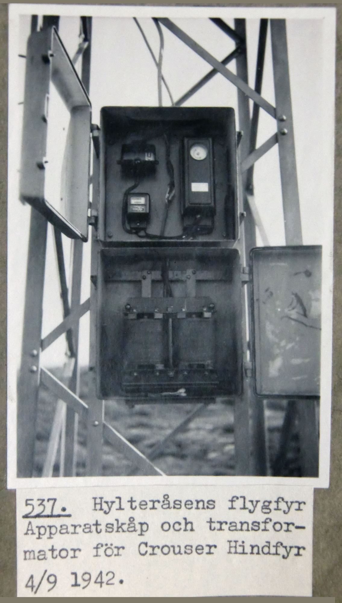 Bild 12. Hylteråsens flygfyr. Apparatskåp och transformator för Crouser Hindfyr. 4/9 1942.