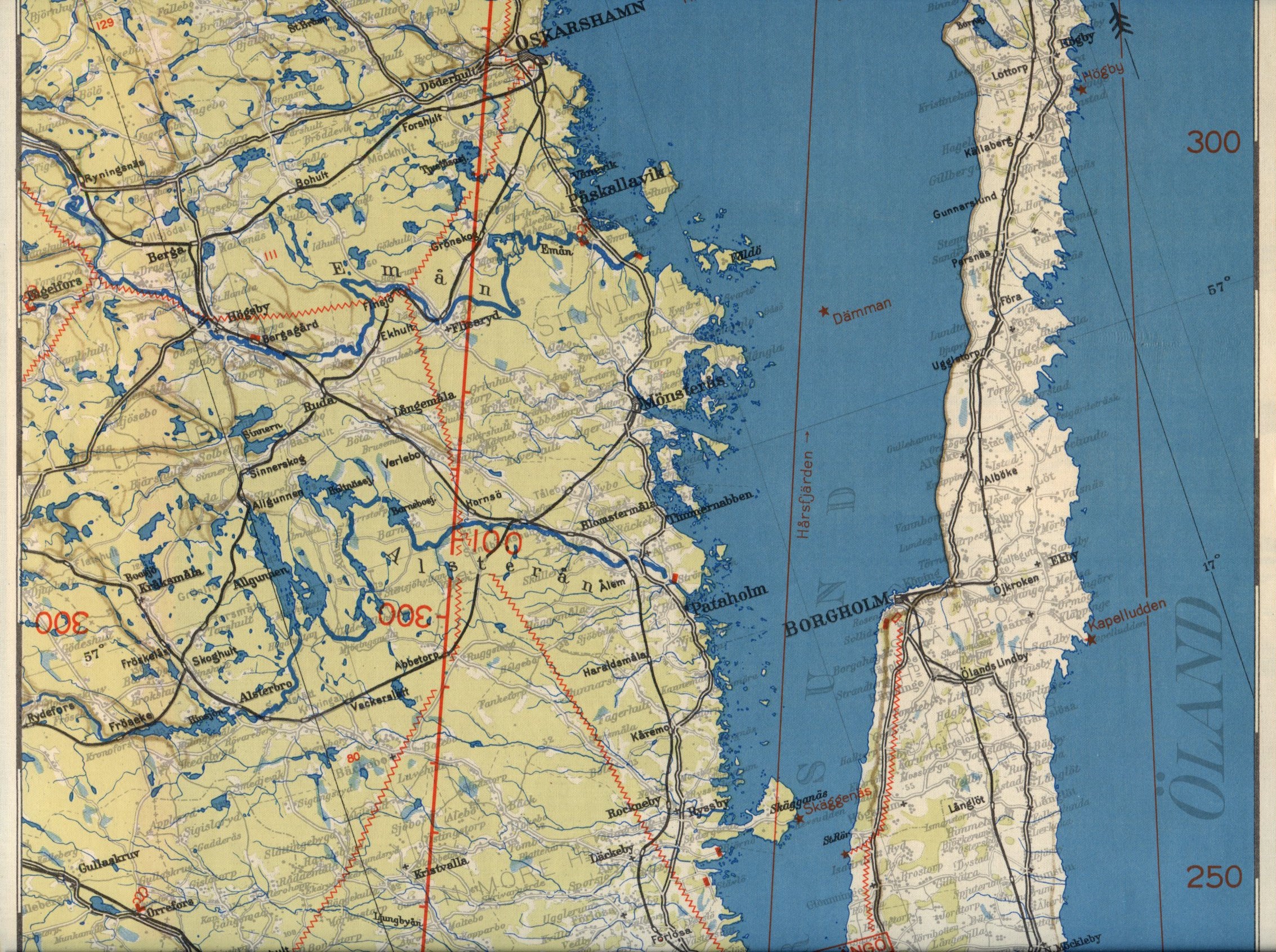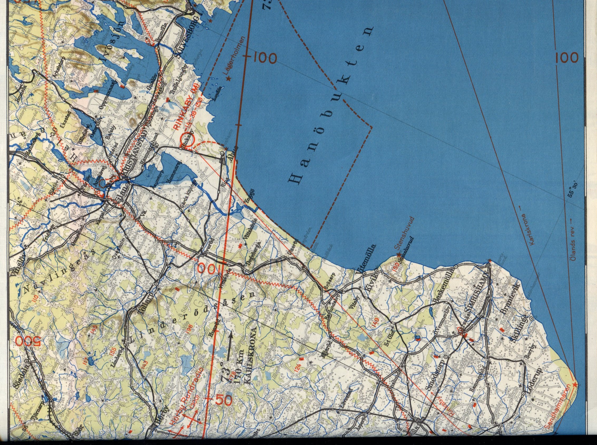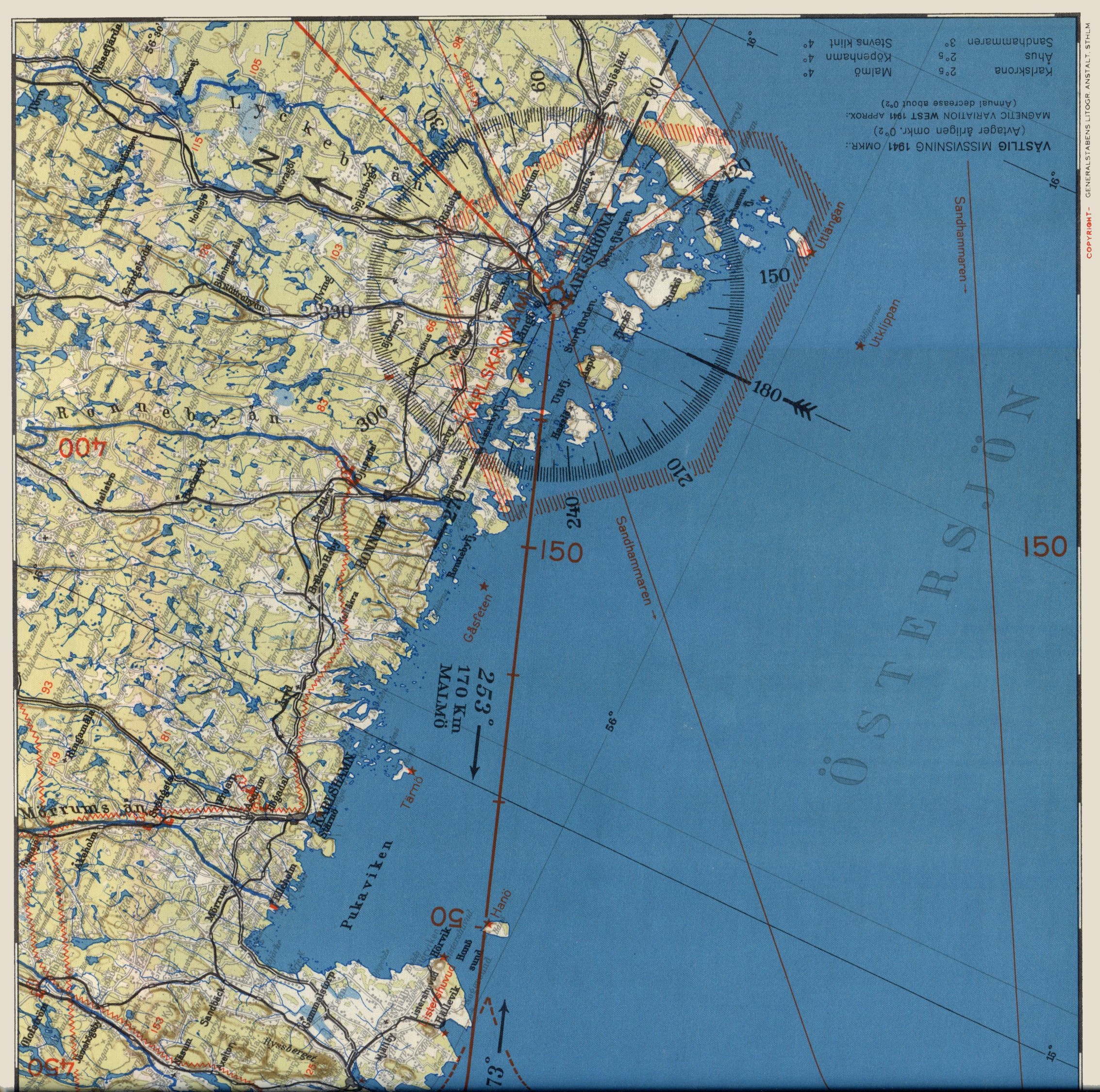 | Flygvapnets Routekarta nr 7. Stockholm - Karlskrona - Malmö, Generalstabens Litografiska Anstalt, 1938.