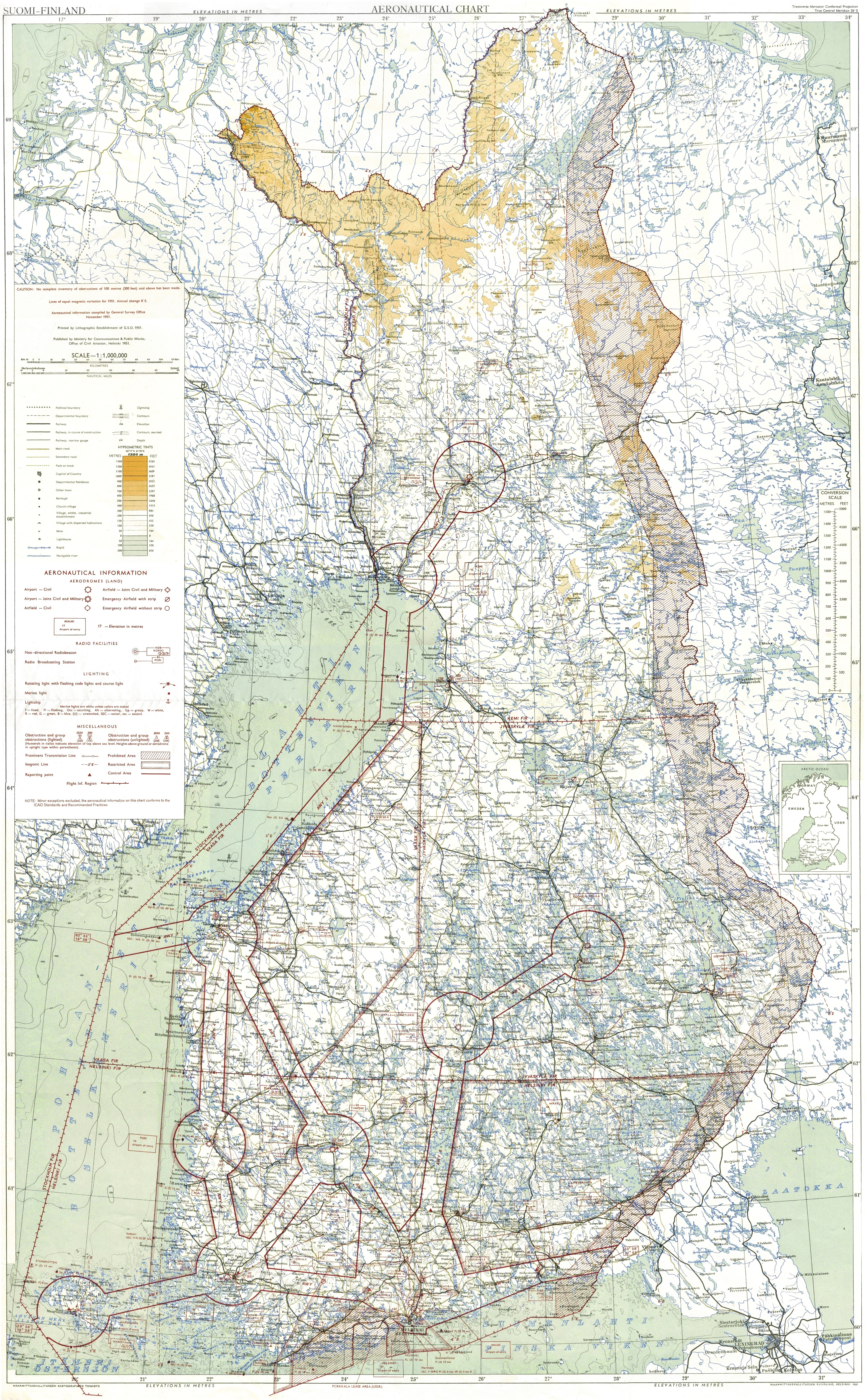 | Map 1. Aeronautical Chart - Suomi-Finland 1951 published by Ministry for Communications, 1951. (copy from Timo Meriluato site, here resized 50%, file size from 34 Mb to 9 Mb!) |