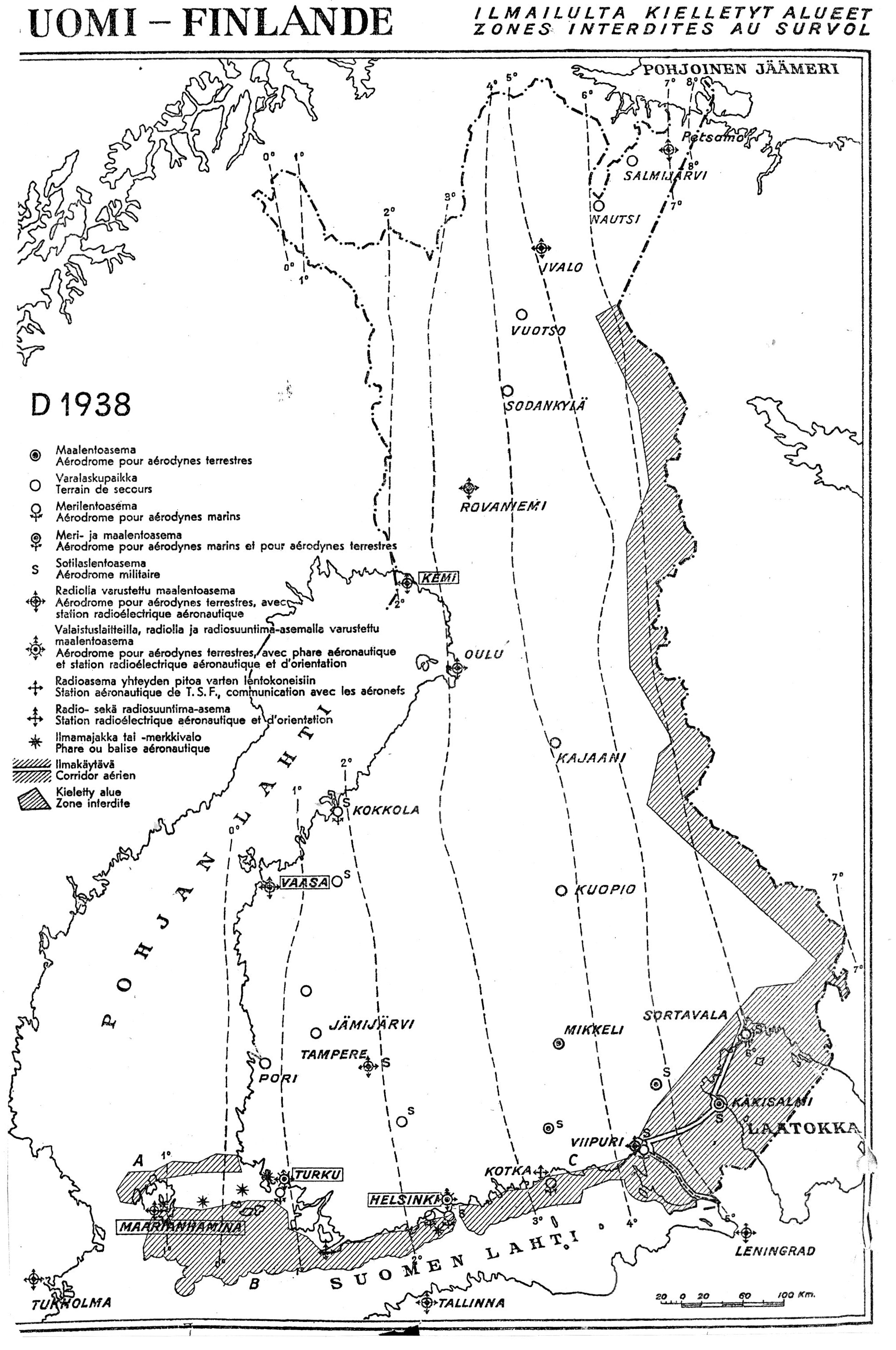4. Aviation facilities 1938 (from Timo Meriluato site) - 11 aerodromes with radio stations. - Radio beacons in Turku, Hanko, Helsinki, Kotka. - Light beacons in Mariehamn, Kumlinge, Iniö, Turku, Helsinki. - Seaplane aerodromes: Kokkola, Mariehamn, Turku, Helsinki, Kotka, Viipuri. Use Ctrl-'+' to enlarge! Map from A. ![]() |