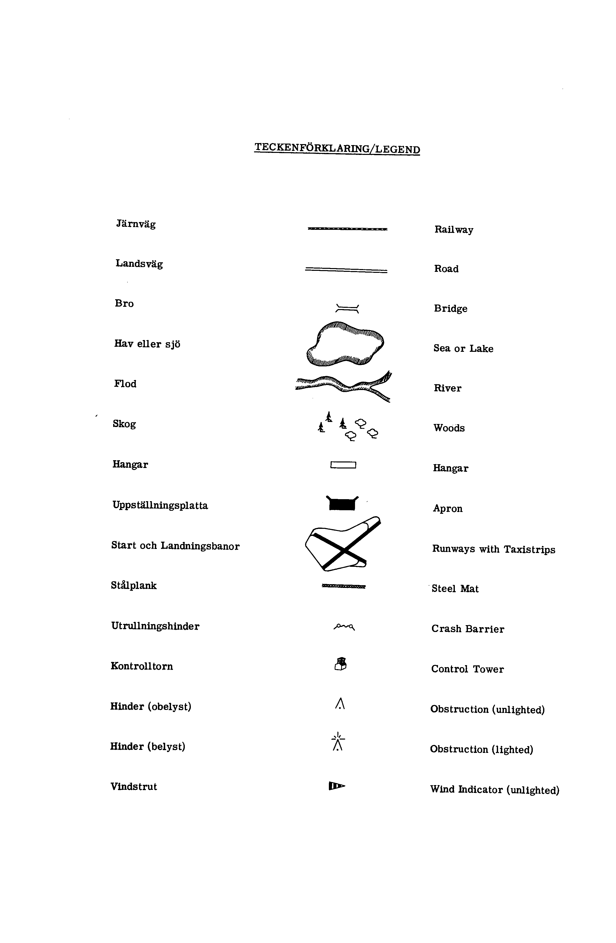 De visar banor, radioutrustning, instrumentlandning m.m. Teckenförklaring • Legend 1 och • Legend 2 En del övningsflygplatser hade utrustning som NDB-fyrar och optiska fyrar (för VFR) symbol: |