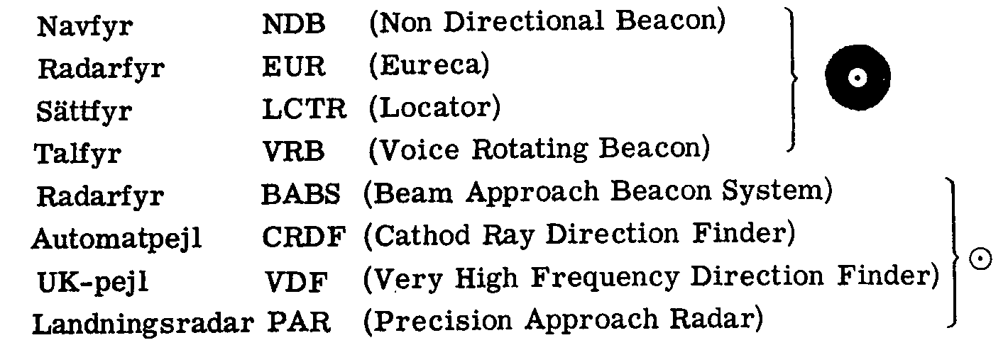 Navfyr NDB oriktad ra-fyr Tidigaste typen av radiofyr. Sänder på MF-frekvenser (MV,GV). Före VK2 använde flygplanen vanligen en utvändig, vridbar loopantenn. Efter VK2 kom spolantenner och ADF, t.ex. i Tunnan. Piloten får riktning till fyren relativt planets färdriktning, men inte bäring (vinkel från Norr) eller avstånd. - NDB finns angiven på alla flottiljer och även på övningsflygfälten Boden, Hagshult, Kiruna, Rommehed. - NDB användes vid navigering och som anflygningsfyr vid Instrumentlandning för Tunnan (Lansen/Draken använde Anita) se kartor under: • A. Flottiljflygplatser |