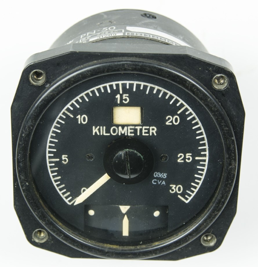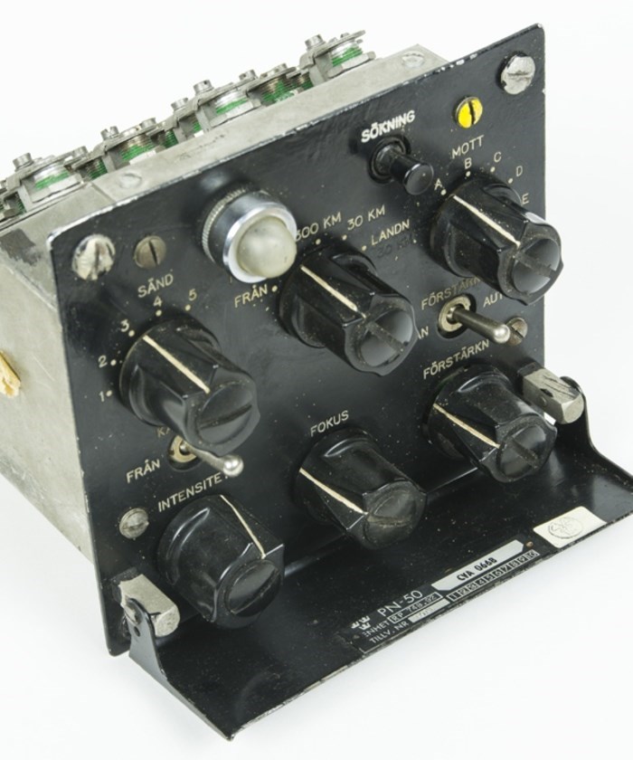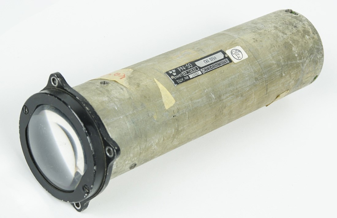 PN-50, foton FV-museum PN-50 Navigeringsinstrument (NI) med avstånd(km) och nedtill pil för anflyg/homer eller läge i sidled vid landning. Pilen "är" flygplanet, mittpunkt i skalan "är" rr-fyren: Katodstrålerör för navigatören i A32, satt intill radarindikatorn. Visade med svep riktning + avstånd till Anita-fyr. - Framtill ett förstoringsglas, bildskärmen var bara 1 tum! • FV Museums bilder: Sökning med "Lansen radar" på digitaltmuseum.se |