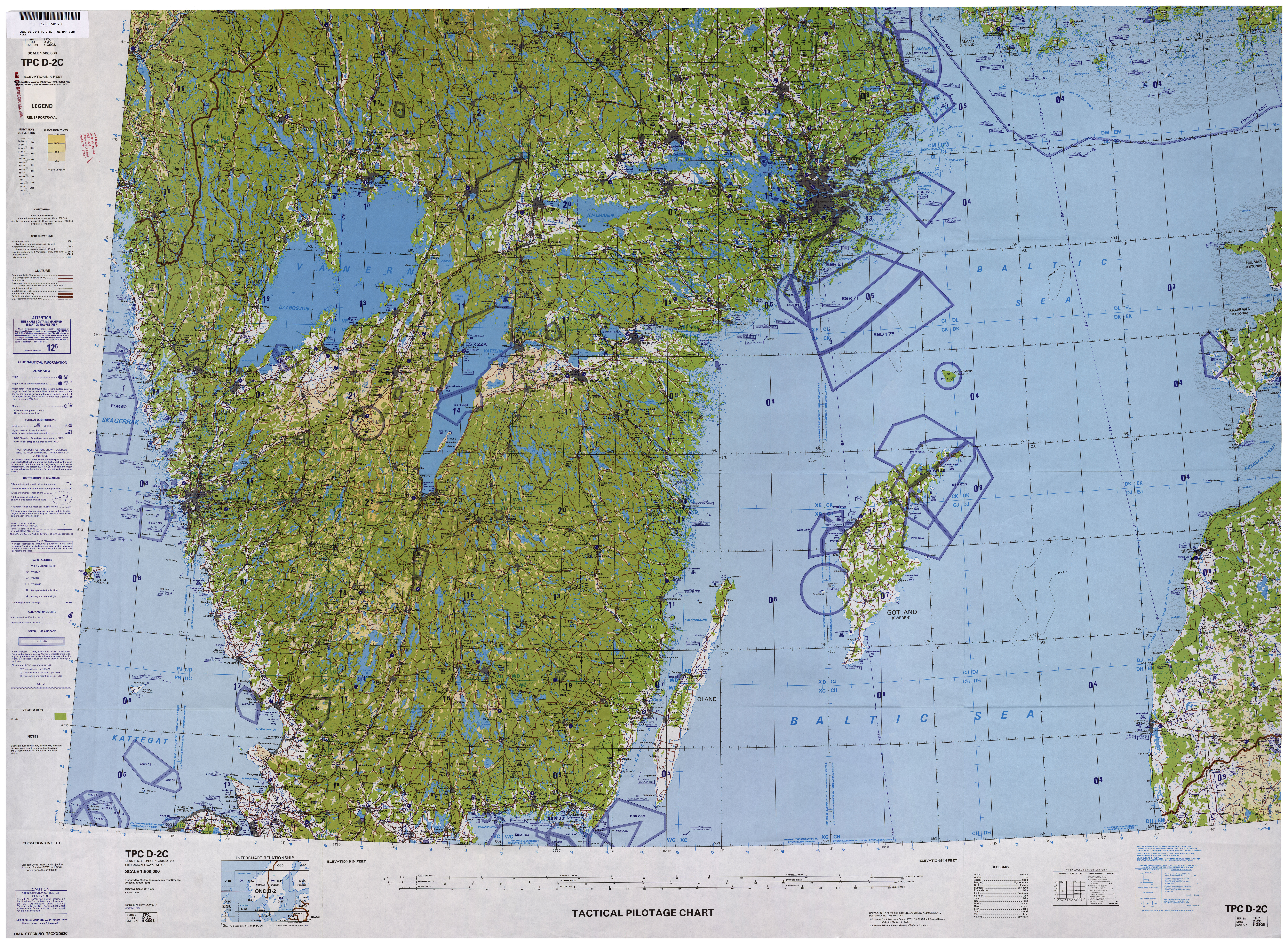 Tactical Pilot Charts täcker hela världen! Alla 655 kartbladen har skannats av University of Texas Libraries. Länkar se nedan. Kartorna har höjdkurvor och markskikt (skog, åker, öken, vatten). Flygplatser markerade med cirklar med huvudbanor och höjd. Kartorna producerades/uppdaterades under 1970- till 1990-talen av US Defence Mapping Agency och motsvarande i UK. Sverige, Norge, Finland, Baltikum, Danmark - täcks med (från N till S): C-2A, C-2B C-2D, C-2C D-2A, D-2B, D-3A D-2D, D-2C(se t.h.), D-3D E-2B, E-3A Island finns på: C-1D Alperna i Schweiz, Italien, Österrike: E-3D, F-2A. Nya Zeeland: R-15A, R-15D, R-15C S-13A, S-13B, S-13D. |