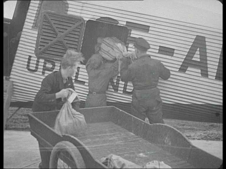 | Filmtext: "Nattpostbefordran per flyg." "Postbefordringstid: Stockholm - London: per järnväg och båt: 47 tim. per flygplan: 16 tim. |