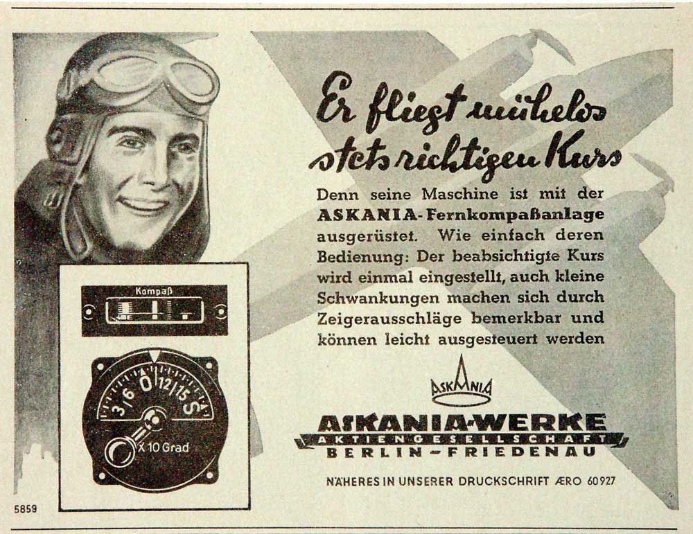 Tysk annons för Askania Fernkompass, 1941 Bild från Compass Museum, länk nedan. Texten i översättning: "Han flyger lätt ständigt på rätt kurs - Ty hans maskin är utrustad med en ASKANIA- Fjärrkompassanläggning. Huru enkelt handhavande: När den avsedda kursen en gång blivit inställd gör sig även små avvikelser synliga genom visarutslag och kan lätt bli motstyrda."