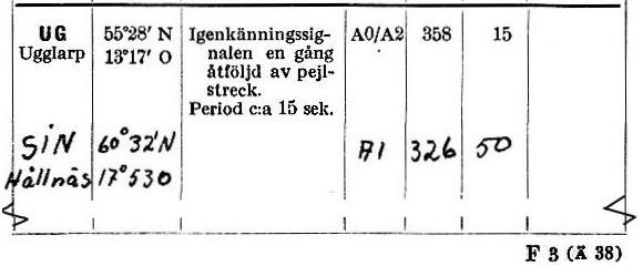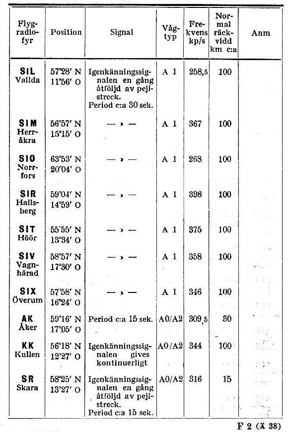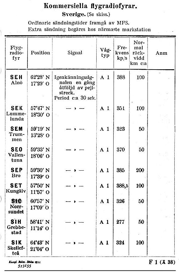 Uppgifter ur FV-Signal 1951, med koordinater lat,long för NDB.