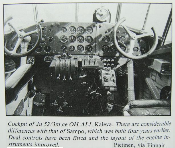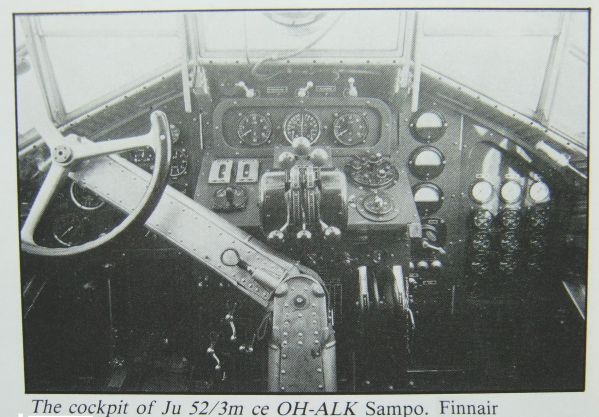 ![]() Finska Aero OY beställde Junkers Ju-52 år 1932, samma år som ABA köpte. Fyra år senare köpte Aero fler plan och bilderna visar att cockpit då förbättrats en hel del. - Foton ur John Wegg's bok Finnair, se ref. nedan. |