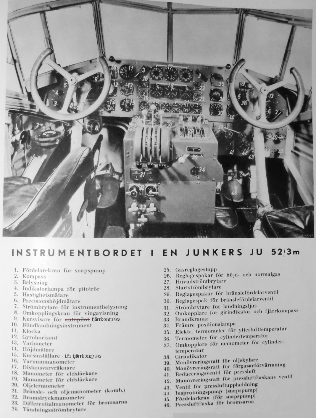 hos ABA och Aero Oy hade en radiopejl som sköttes av andre-piloten. Här ett foto från cockpit med flera intressanta navigationsinstrument: - Fjärrkompass, Lorenz instrumentlandning, Telefunken pejl P53N, Lorenz radio. - Bilder med dessa markerade, nedanför fotot! Bild 2. Junkers Ju52/3m g. Foto från SFF Bildarkiv, nr. 002-1075746, okänd fotograf.
