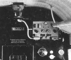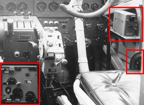 | 1. De första versionerna av Ju-52 hos ABA och Aero Oy hade en radiopejl som sköttes av telegrafist/ navigatör bakom piloterna. Här ett foto från det inre av kabinen där man längst bort ser en pejlutrustning av typ Telefunken 173N (ty. Peilempfänger 173N). I taket syns vridhandtaget för pejlramen. Nedanför radion syns några instrument.