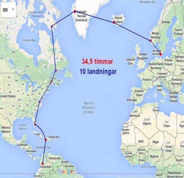 träningsutrustning för Saab 340, Powerplant trainer och EFIS trainer. Sedan 2009 är jag pensionerad som flygkapten från Skyways, före det flög jag hos Swedair i Växjö, Basair och Malmros Aviation. - Kortaste rutten var pendeln mellan Bulltofta och Kastrup som jag flög i ett år med Twin Otter - 11 min flygtid och sedan danskt smörrebröd i cantinen! Längsta var en leveransflygning av en Fokker F-27 från Malmö till Colombia via Grönland och USA. Där hemma har jag en Microsoft FSX simulator som jag flyger ibland. Ett antal gånger per år åker jag till Ängelholms flygmuseum och flyger Draken-simulatorn. Eftersom jag inte har flugit militärt tycker jag det är en ny utmaning att flyga Draken. Det har nog blivit 30-35 timmar." | - Flygpendeln Bulltofta-Kastrup - se karta längre ner. - Colombiaflygningen. Karta från Folkes föredrag hos F10 kamratförening 2017-03-15.