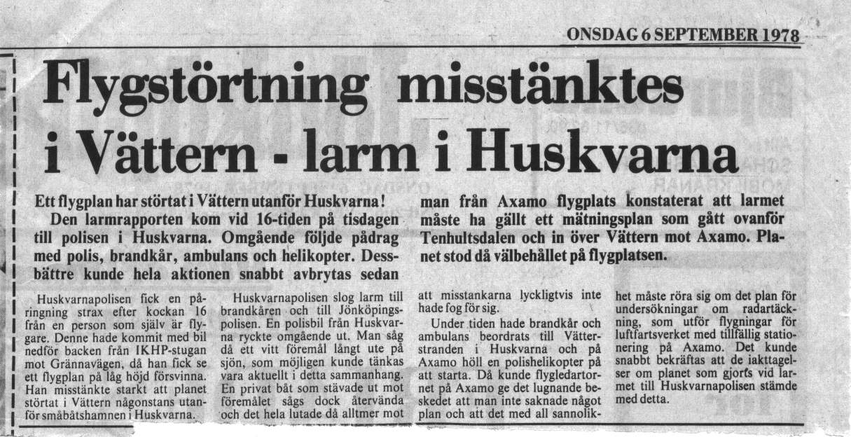 att testflyga de här nybyggda radarstationerna. Det var: 1. Romeleradarn 2. Radarn på Hallandsåsen 3. Smålands radar som jag höll på och testflög i flera veckor. Jag kommer i håg att vi flög längs en linje från radarn och ut i sydostlig riktning bort mot ryska territorialgränsen på 20.000 fot. Den sträckan flög vi många många gånger. Det var för att teknikerna skulle kunna se hur radarn tog emot signalerna i olika höjdvinklar. När vi var längst borta i sydost och svängde runt meddelade teknikerna ibland att jag hade fått följeslagare. Det var ryska jaktflyget som var ute och tittade vad vi var för några. Vi hade även en övning där vi skulle flyga på 200 fot i en cirkel runt radarstationen för att se hur täckningen var på låg höjd i olika bäringar. Vi flög i vänstervarv och det bar sig så att vi kom precis i ravinen över Huskvarna och ner över Vättern. Folke blev hysteriska och ringde räddningstjänsten och meddelade att ett flygplan hade flugit ut över Vättern och störtat. Det var även reportage i lokalradion. Det var inte så farligt - det var bara vi som testflög. Se tidningsurklippet nedan. 4. Arlanda radar flög jag också i ett par veckor. 5. Sundsvalls radar var ett annat omfattande projekt, där var jag nog i fyra veckor. De flygplan som jag använde var PA 31 Navajo. När vi flög på höga höjder hade jag alltid en kompis med för att vi skulle hjälpas åt att övervaka syretillförseln. Vi hade en portabel syrgasflaska och en liten mask." |