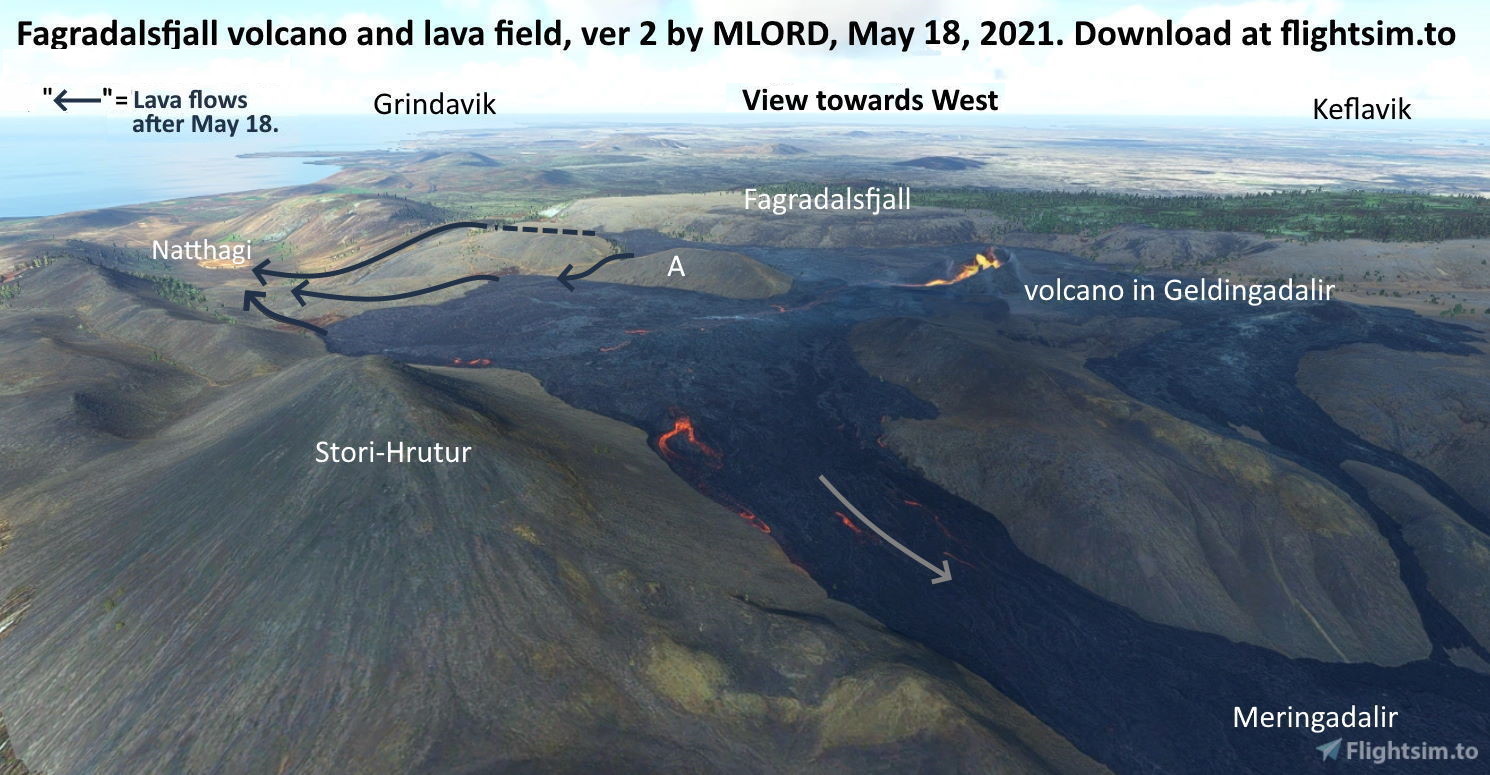 Vulkaner - Fagradalsfjall aktiv 2021, turistmål!![]() Webcam ovan, MSFS addon av MLORD nedan ![]() Lavaflöden efter 18 maj indikerade (13 juni). |