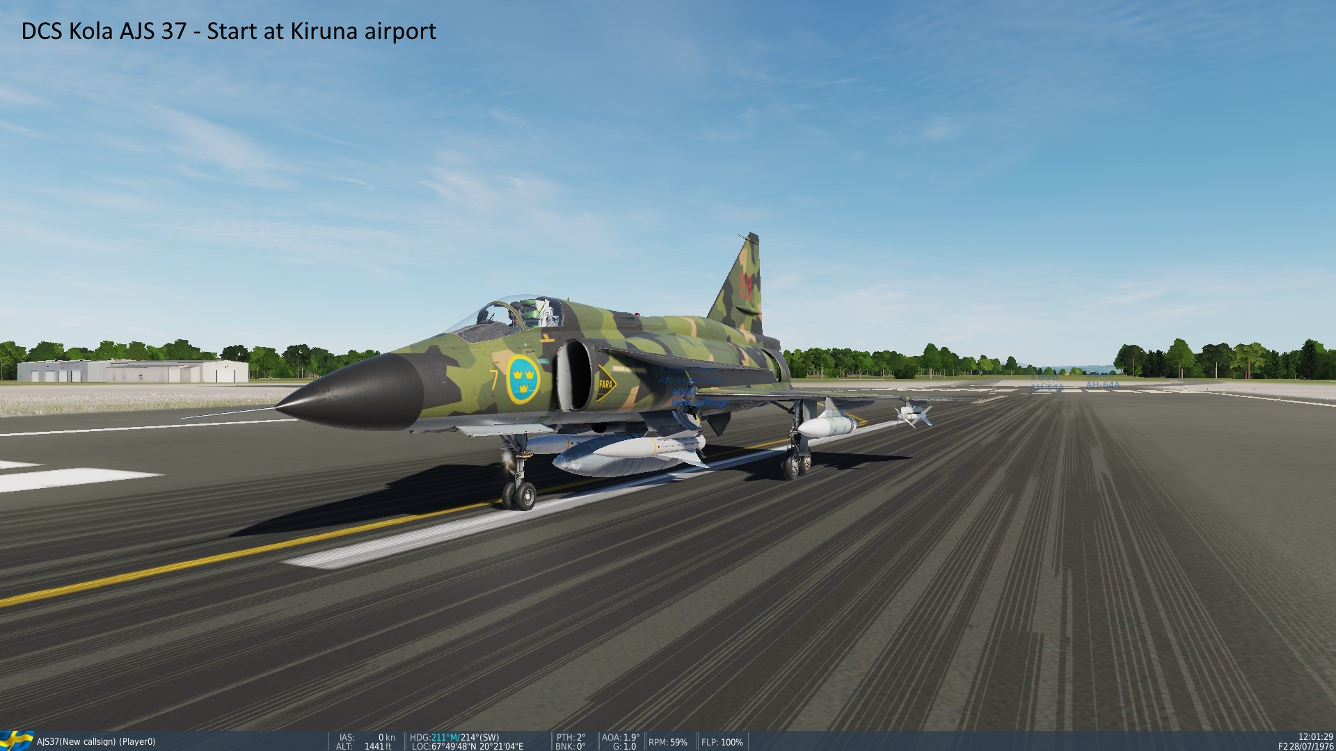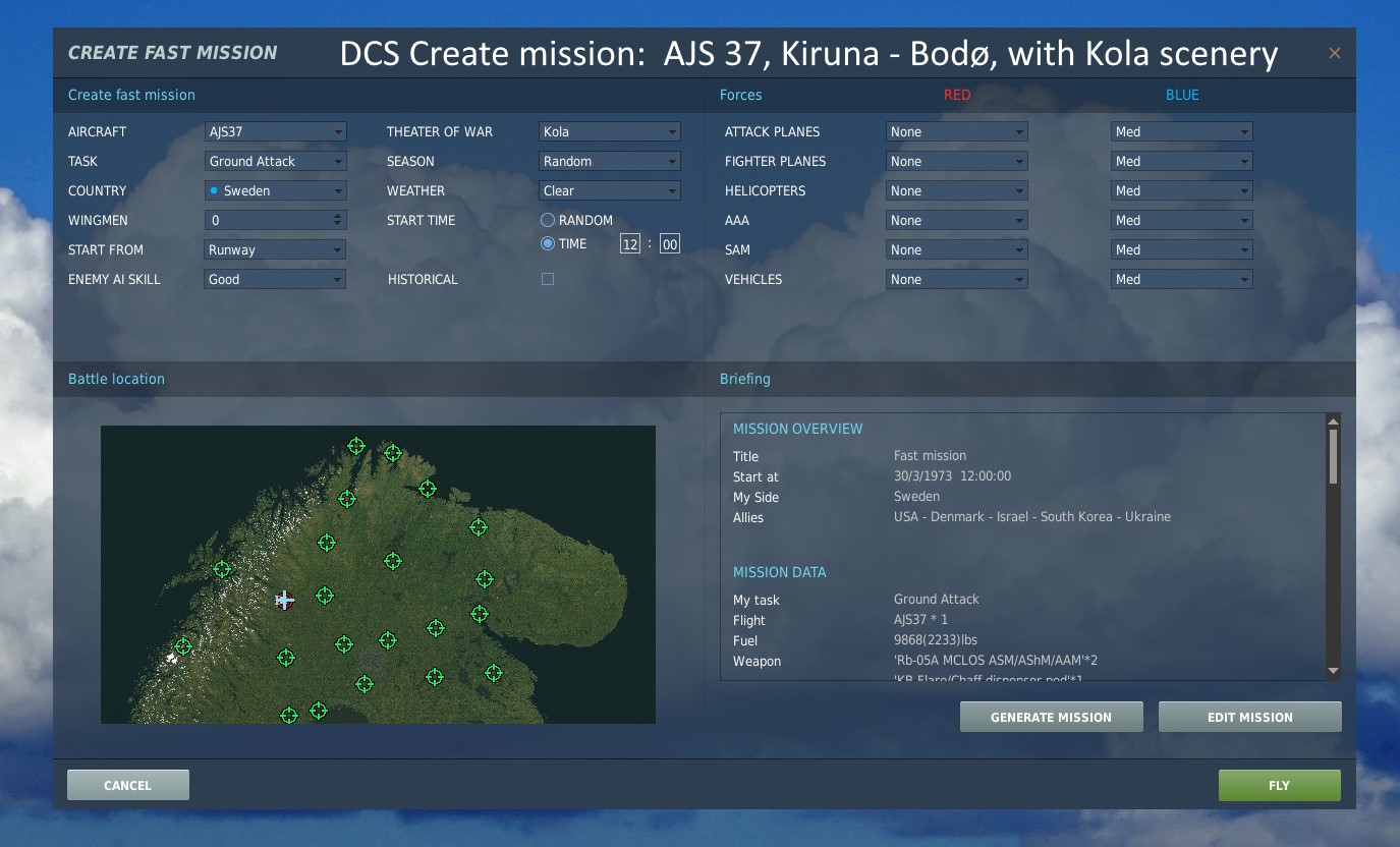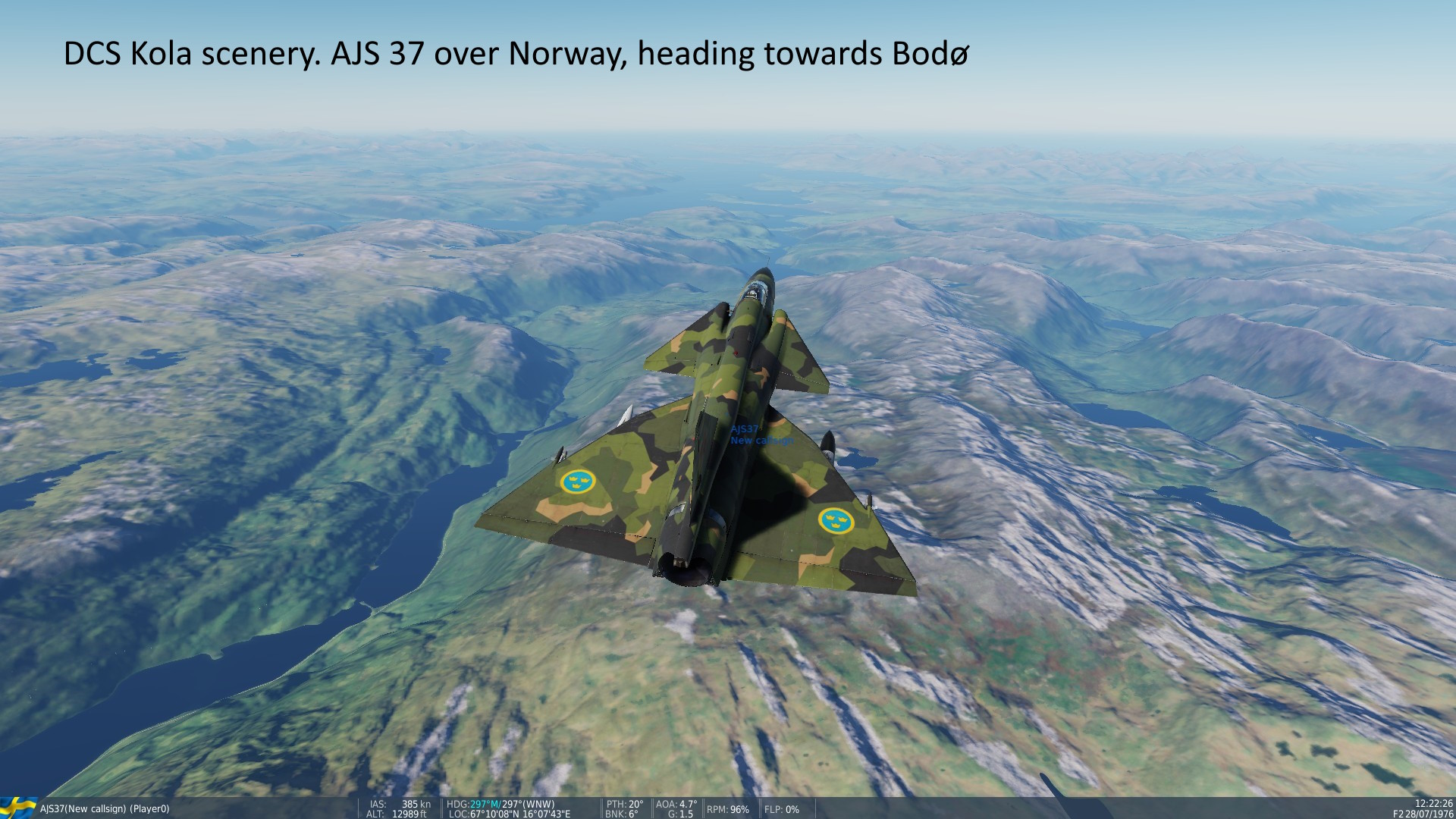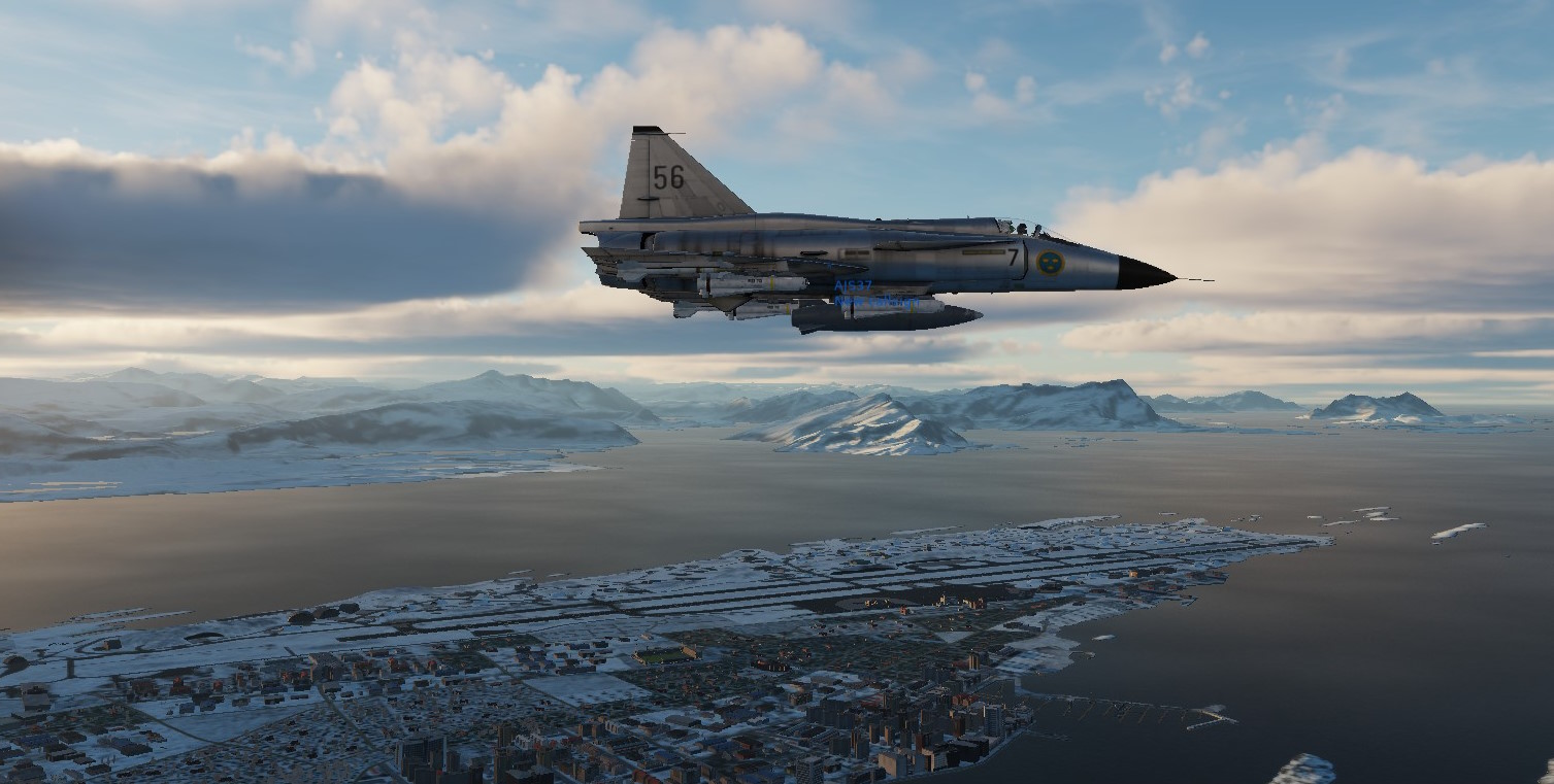 • "Kola", info hos Orbx - Norr om lat 65°: Nordkalotten, Kola-halvön, 130GB. Early Access. Ej för Steam-DCS-ver. SAAB AJS 37 Viggen, kan köpas 30$-60$ (olika rabatter!). En study sim! • AJS 37 Short manual, hos Air Goons (många manualer!) Freeware: SK60 och JAS 39 Gripen, lär vara rätt bra. - AJS 37 och Kola-Nordkalotten