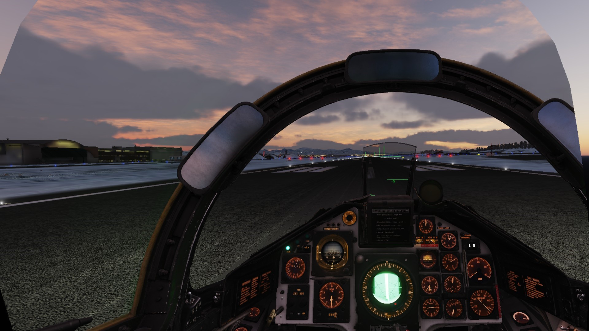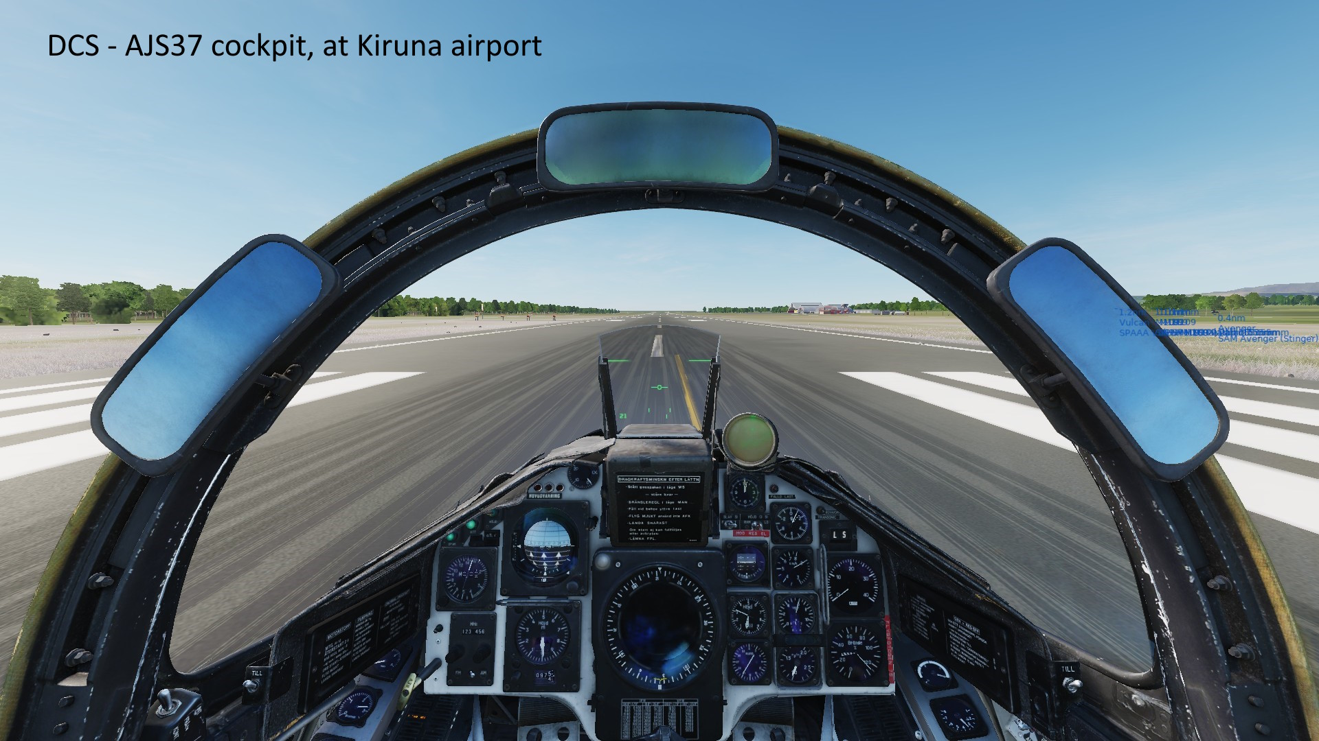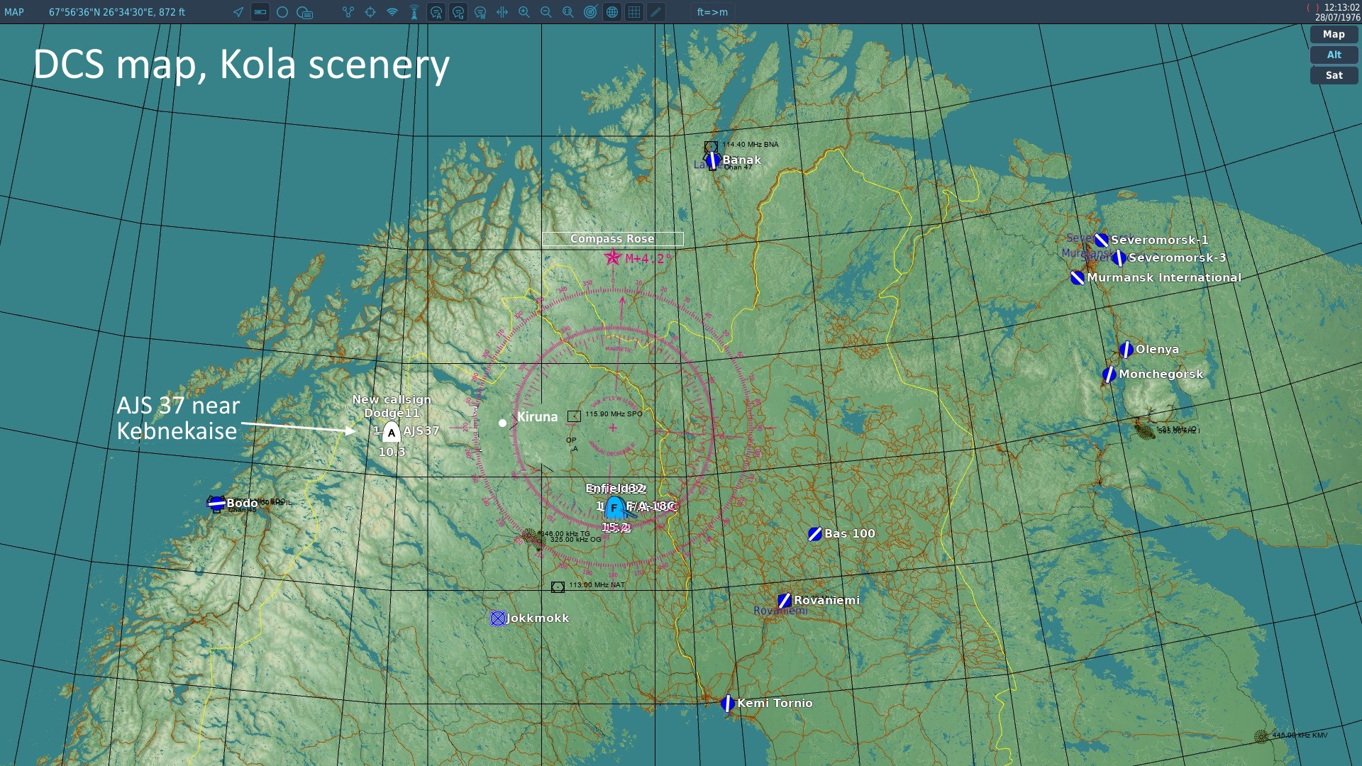 NY! Kola-scenery, Nordkalotten, från Orbx för DCS. Early Access. Flygplatser: Sve: Kiruna, Kalixfors, Jokkmokk, +2 på gång Vidsel o Luleå. Finland: Kemi-Tornio, Rovaniemi, Bas100, +1 Ryssland: 5st runt Murmansk, +2 Norge: Bodö, Lakselv, +6 på gång. Scenerier: Höjdnivåer, marktexturer, skog klara i hela området. Byggnader klara i närhet av färdiga flygplatser (Gröna/Gula i karta ovan). Bilder AJS37 i VR - tagna med PrtScr Över Kiruna - Cockpit, VR ger vidbild! - C.vänster, Autopilot