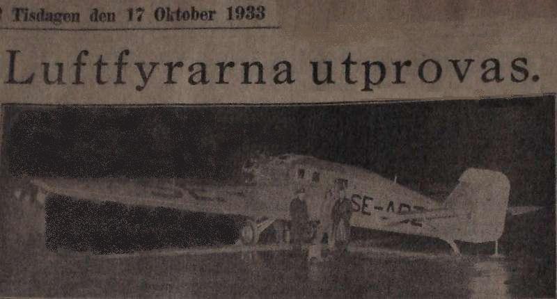 "De prov som skola utföras för att utröna den lämpligaste belysningen å våra luftrouter, togo i går afton sin början genom att ett av flygvapnets plan kl. 6,40 lämnade Malmslätt med kurs på Bulltofta. Flygplanet, som var av Fokkertypen, fördes därvid av löjtnant Stig Sund- gren. Det anlände på grund av mot- vind hit först kl. 10,30. Tio minuter senare startade a.-b. Aerotransports nattpostmaskin, SE-ABZ, för att flyga till Visingsö, vända där och gå tillbaka till Malmö. Denna maskin fördes av löjtnant M. Lindholm och dessutom medföljde löjtnant Hj. Bosson. Maski- nen landade åter på Bulltofta vid 2-tiden efter en i allo lyckad flygning. Proven upprepas afton och på ons- dag. Civilingenjör Tord Ångström i Flygstyrelsen anlände hit i går för att övervara försöken och under tiden, som flygningarna pågingo, stod man i radio- förbindelse med flygarna. Vår bild härovan visar Aerotransports SE-ABZ startfärdig för inspektionsfärden." - - - |