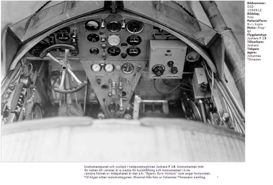 Cockpit troligen till en Junkers F13 med mycket moderniserad instrumentutrustning. SFF Fotoarkiv nr 02-1054912.